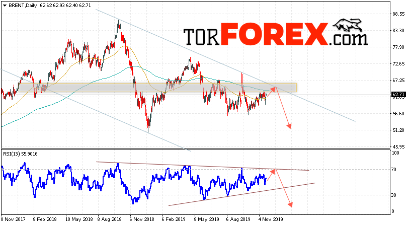 Таким образом, Прогноз цен на нефть BRENT на 25 — 29 ноября 2019 предполагает попытку теста области сопротивления вблизи уровня 63.45. Откуда стоит ожидать отскок и попытку падения нефти с потенциальной целью на уровне 51.25. Дополнительным сигналом в пользу снижения цены нефти выступит тест линии тренда на индикаторе относительной силы. Отменой варианта падения станет сильный рост и пробой области 68.65. Это укажет на пробой верхней границы нисходящего канала и продолжение подъёма цены нефти с целью выше 74.15.