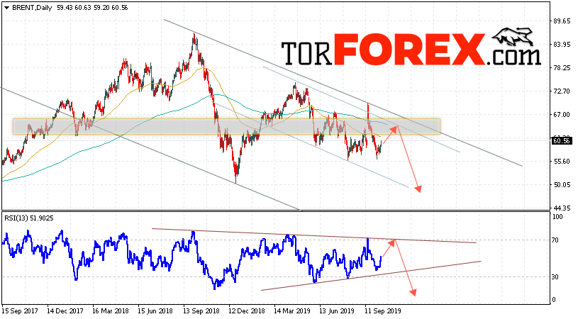 Дополнительным сигналом в пользу снижения котировок нефти на текущей неделе выступит тест линии сопротивления на индикаторе относительной силы. Вторым сигналом станет отскок от верхней границы нисходящего канала. Отменой варианта падения котировок и цен на нефть BRENT на торговой неделе 14 — 18 октября 2019 станет сильный рост и пробой уровня 68.65. Это укажет на пробой верхней границы нисходящего канала и продолжение роста нефти в область выше уровня 74.55. С пробоем области поддержки и и закрытием котировок ниже уровня 54.65 стоит ожидать подтверждения снижения цены на нефть BRENT.