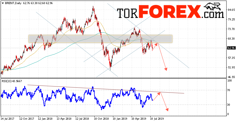 Дополнительным сигналом в пользу снижения котировок нефти на текущей неделе выступит тест линии сопротивления на индикаторе относительной силы. Вторым сигналом станет отскок от верхней границы нисходящего канала. Отменой варианта падения котировок и цен на нефть BRENT на торговой неделе 22 — 26 июля 2019 станет сильный рост и пробой уровня 69.05. Это укажет на пробой верхней границы канала и продолжение роста нефти в область выше уровня 74.65. С пробоем области поддержки и и закрытием котировок ниже уровня 58.35 стоит ожидать подтверждения снижения цены на нефть BRENT.