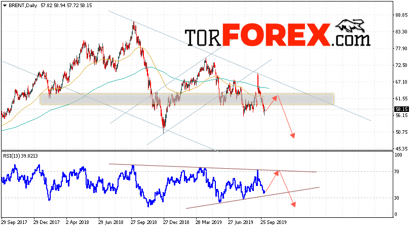 Дополнительным сигналом в пользу снижения котировок нефти на текущей неделе выступит тест линии сопротивления на индикаторе относительной силы. Вторым сигналом станет отскок от верхней границы нисходящего канала. Отменой варианта падения котировок и цен на нефть BRENT на торговой неделе 7 — 11 октября 2019 станет сильный рост и пробой уровня 68.55. Это укажет на пробой верхней границы нисходящего канала и продолжение роста нефти в область выше уровня 74.05. С пробоем области поддержки и и закрытием котировок ниже уровня 55.05 стоит ожидать подтверждения снижения цены на нефть BRENT.