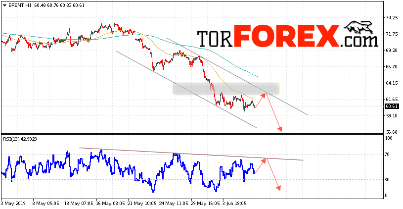 Таким образом, Аналитика и прогноз цен на нефть на 7 июня 2019 предполагает попытку теста уровня сопротивления вблизи области 61.95. Далее, продолжение падения с целью ниже уровня 56.55. В пользу снижения выступит тест линии тренда на индикаторе относительной силы. Отменой варианта падения цены нефти BRENT станет сильный рост и пробой уровня 65.45. Это укажет на продолжение подъёма котировок в область выше уровня 69.45.