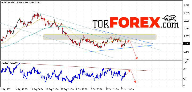 В пользу снижения котировок и цен на Natural Gas выступит тест линии тренда на индикаторе относительной силы. Вторым сигналом станет отскок от верхней границы нисходящего канала. Отменой варианта падения цен на природный газ станет сильный рост и пробой уровня 2.45. Это укажет на пробой области сопротивления и продолжение роста котировок в область выше уровня 2.95. Подтверждением снижения котировок выступит пробой нижнем границы модели «Треугольник» и закрытие цен Natural Gas ниже уровня 2.15.