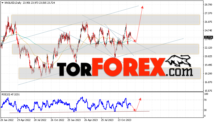 В пользу роста котировок и цен на Серебро на текущей торговой неделе 1 — 5 января 2024 выступит отскок от линии поддержки на индикаторе относительной силы. Вторым сигналом станет отскок от верхней границы нисходящего канала, который был пробит покупателями вверх. Отменой варианта роста котировок XAG/USD выступит падение и пробой области 21.55. Это укажет на пробой области поддержки и продолжение падения цен на Серебро с целью ниже уровня 17.45. Подтверждением развития росту выступит пробой уровня сопротивления и закрытие цен выше уровня 25.05.