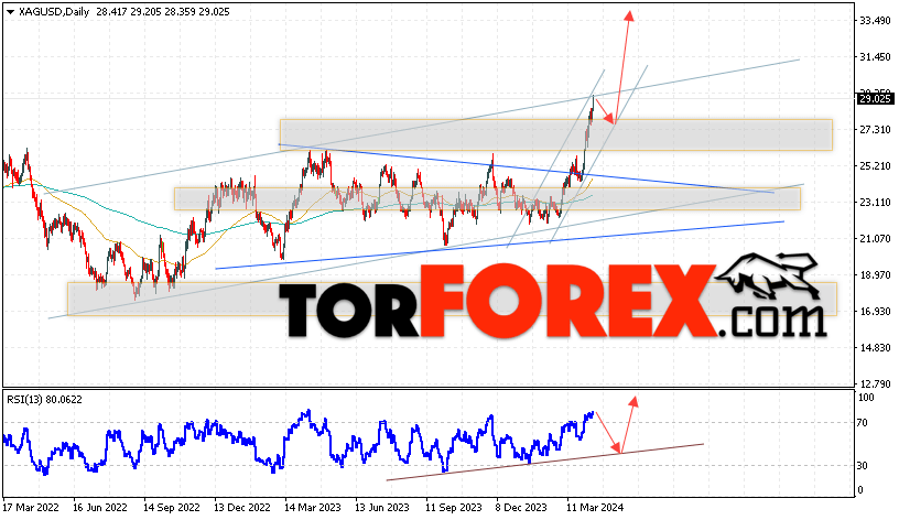 В пользу роста котировок и цен на Серебро на текущей торговой неделе 15 — 19 апреля 2024 выступит отскок от линии поддержки на индикаторе относительной силы. Вторым сигналом станет отскок от нижней границы бычьего канала. Отменой варианта роста котировок XAG/USD выступит падение и пробой области 26.75. Это укажет на пробой области поддержки и продолжение падения цен на Серебро с целью ниже уровня 23.75. Подтверждением развития росту выступит пробой уровня сопротивления и закрытие цен выше уровня 31.05, что укажет на пробой верхней границы бычьего канала.