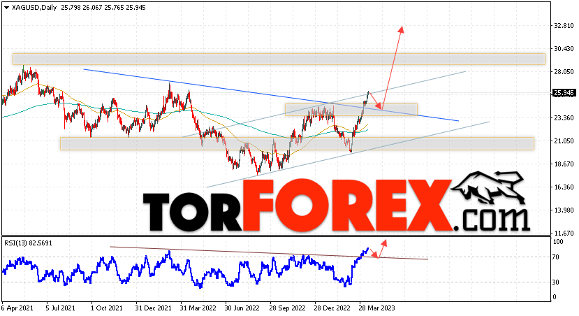 В пользу подъёма котировок и цен на Серебро на текущей торговой неделе 17 — 21 апреля 2023 выступит отскок от линии поддержки на индикаторе относительной силы. Вторым сигналом станет отскок от лини ”Шеи” разворотной модели ”Голова и плечи”. Отменой варианта роста котировок XAG/USD выступит падение и пробой области 18.55. Это укажет на пробой области поддержки и продолжение падения цен на Серебро с целью ниже уровня 15.35. Подтверждением развития роста выступит пробой уровня сопротивления и закрытие цен выше уровня 26.85, что укажет на пробой верхней границы разворотной модели ”Голова и плечи” и начало отработки паттерна с целями вверху.