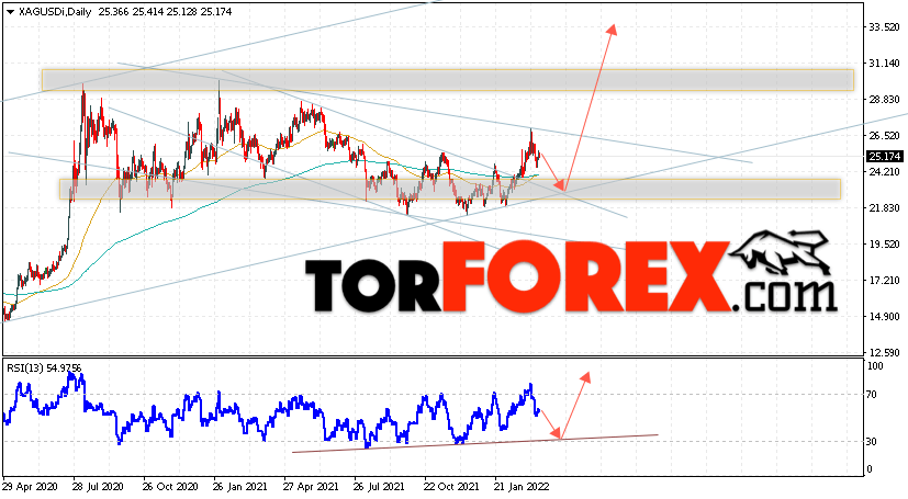 В пользу роста котировок и цен на Серебро на текущей торговой неделе 21 — 25 марта 2022 выступит отскок от линии поддержки на индикаторе относительной силы. Вторым сигналом станет отскок от верхней границы медвежьего канала. Отменой варианта роста котировок XAG/USD выступит падение и пробой области 20.05. Это укажет на пробой области поддержки и продолжение падения цен на Серебро с целью ниже уровня 16.55. Подтверждением развития роста выступит пробой уровня сопротивления и закрытие цен выше уровня 26.85, что укажет на пробой верхней границы нисходящего канала коррекции.