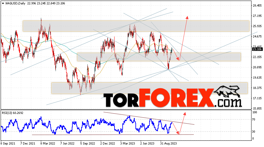 Таким образом, Прогноз цен на Серебро на 23 — 27 октября 2023 предполагает попытку теста уровня поддержки вблизи области 21.95. Затем, продолжение роста цен на Серебро с целью выше уровня 27.25. В пользу роста выступит тест линии тренда на индикаторе относительной силы. Отменой варианта роста XAG/USD станет падение и пробой уровня 19.85. Это укажет на продолжение снижения котировок в область ниже уровня 17.65.