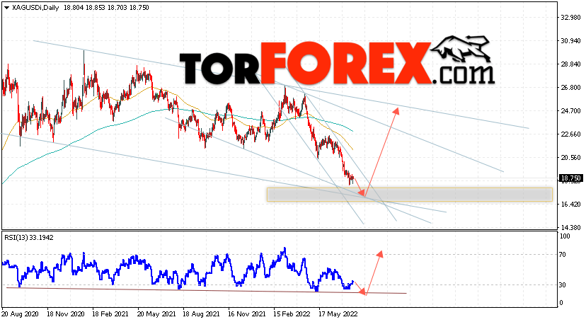 В пользу подъёма котировок и цен на Серебро на текущей торговой неделе 25 — 29 июля 2022 выступит отскок от линии поддержки на индикаторе относительной силы. Вторым сигналом станет отскок от нижней границы медвежьего канала. Отменой варианта роста котировок XAG/USD выступит падение и пробой области 15.75. Это укажет на пробой области поддержки и продолжение падения цен на Серебро с целью ниже уровня 13.35. Подтверждением развития роста выступит пробой уровня сопротивления и закрытие цен выше уровня 19.85, что укажет на пробой верхней границы нисходящего канала коррекции.