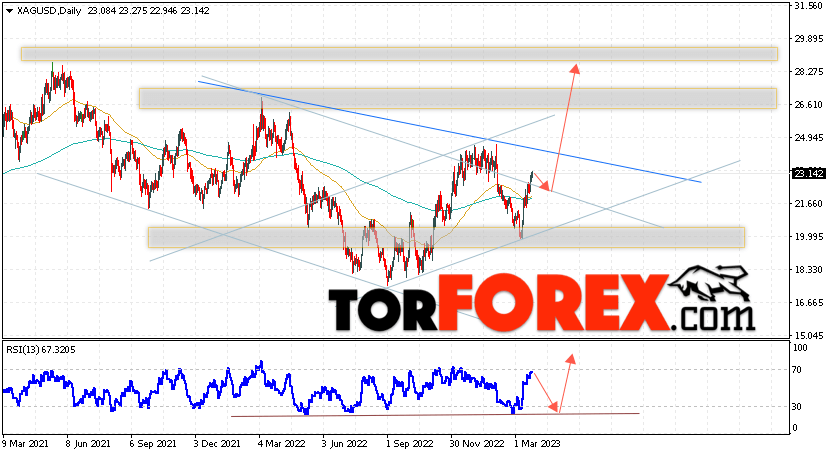 Таким образом, Прогноз цен на Серебро на 27 — 31 марта 2023 предполагает попытку теста уровня поддержки вблизи области 21.75. Затем, продолжение роста цен на Серебро с целью выше уровня 28.35. В пользу подъёма выступит тест линии тренда на индикаторе относительной силы. Отменой варианта роста XAG/USD станет падение и пробой уровня 18.25. Это укажет на продолжение снижения котировок в область ниже уровня 15.35.