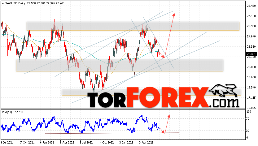В пользу подъёма котировок и цен на Серебро на текущей торговой неделе 3 — 7 июля 2023 выступит отскок от линии поддержки на индикаторе относительной силы. Вторым сигналом станет отскок от нижней границы бычьего канала. Отменой варианта роста котировок XAG/USD выступит падение и пробой области 20.55. Это укажет на пробой области поддержки и продолжение падения цен на Серебро с целью ниже уровня 17.75. Подтверждением развития роста выступит пробой уровня сопротивления и закрытие цен выше уровня 23.45, что укажет на пробой верхней границы нисходящего канала коррекции.