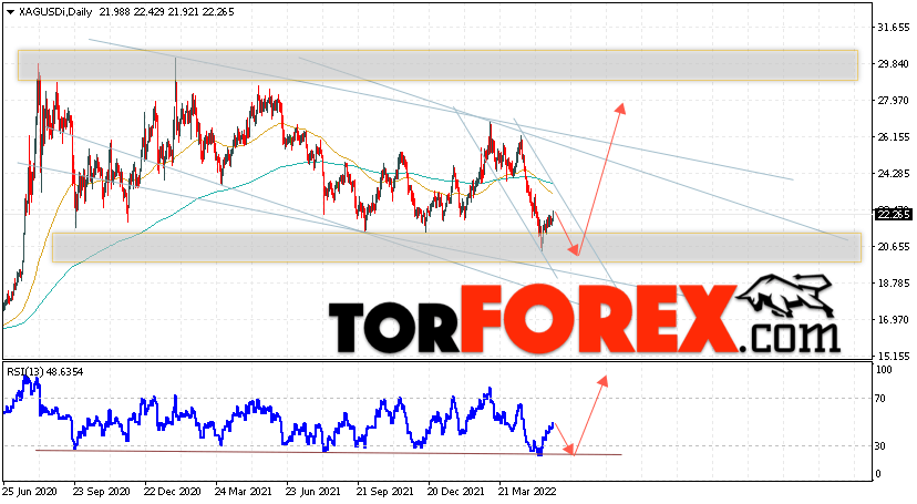 В пользу роста котировок и цен на Серебро на текущей торговой неделе 30 мая — 3 июня 2022 выступит отскок от линии поддержки на индикаторе относительной силы. Вторым сигналом станет отскок от нижней границы медвежьего канала. Отменой варианта роста котировок XAG/USD выступит падение и пробой области 17.45. Это укажет на пробой области поддержки и продолжение падения цен на Серебро с целью ниже уровня 13.35. Подтверждением развития роста выступит пробой уровня сопротивления и закрытие цен выше уровня 22.65, что укажет на пробой верхней границы нисходящего канала коррекции.