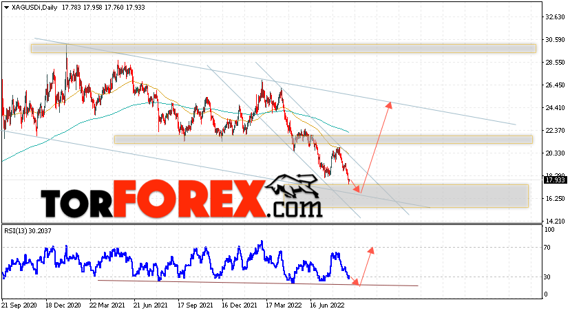 В пользу подъёма котировок и цен на Серебро на текущей торговой неделе 5 — 9 сентября 2022 выступит отскок от линии поддержки на индикаторе относительной силы. Вторым сигналом станет отскок от нижней границы нисходящего канала Отменой варианта роста котировок XAG/USD выступит падение и пробой области 16.05. Это укажет на пробой области поддержки и продолжение падения цен на Серебро с целью ниже уровня 12.65. Подтверждением развития роста выступит пробой уровня сопротивления и закрытие цен выше уровня 20.65, что укажет на пробой верхней границы нисходящего канала.