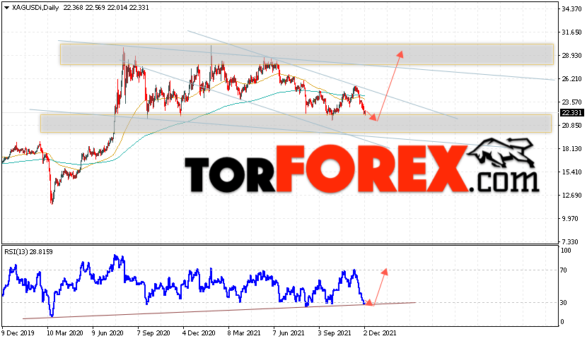 В пользу роста котировок и цен на Серебро на текущей торговой неделе 6 — 10 декабря 2021 выступит отскок от линии тренда на индикаторе относительной силы. Вторым сигналом станет отскок от нижней границы медвежьего канала. Отменой варианта роста котировок XAG/USD выступит падение и пробой области 19.05. Это укажет на пробой области поддержки и продолжение падения цен на Серебро с целью ниже уровня 15.05. Подтверждением развития роста выступит пробой уровня сопротивления и закрытие цен выше уровня 26.35, что укажет на выход цены за пределы нисходящего канала коррекции.