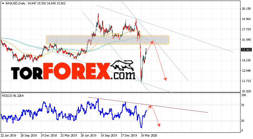 В пользу падения котировок и цен на Серебро на текущей торговой неделе 13 — 17 апреля 2020 выступит тест линии сопротивления на индикаторе относительной силы. Вторым сигналом станет отскок от верхней границы нисходящего канала. Отменой варианта снижения котировок XAG/USD выступит сильный рост и пробой области 17.35. Это укажет на пробой верхней границы нисходящего канала и продолжение роста цен на Серебро с целью выше уровня 18.15. Подтверждением развития нисходящей тенденции выступит пробой области поддержки и закрытие ниже уровня 14.15. Это укажет на ускорение падения цены на Серебро.