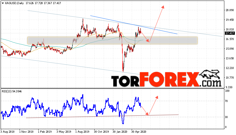 В пользу подъёма котировок и цен на Серебро на текущей торговой неделе 15 — 19 июня 2020 выступит тест линии линии тренда на индикаторе относительной силы. Вторым сигналом станет отскок от верхней границы нисходящего канала. Отменой варианта роста котировок XAG/USD выступит падение и пробой области 14.45. Это укажет на пробой области поддержки и продолжение падения цен на Серебро с целью ниже уровня 13.05. Подтверждением развития восходящей тенденции выступит пробой верхней границы нисходящего канала и закрытие выше уровня 18.35. Это укажет на ускорение подъёма цены на Серебро.