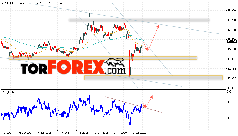 В пользу подъёма котировок и цен на Серебро на текущей торговой неделе 18 — 22 мая 2020 выступит тест линии пробитой линии тренда на индикаторе относительной силы. Вторым сигналом станет отскок от верхней границы нисходящего канала. Отменой варианта роста котировок XAG/USD выступит падение и пробой области 13.85. Это укажет на пробой области поддержки и продолжение падения цен на Серебро с целью ниже уровня 13.05. Подтверждением развития восходящей тенденции выступит пробой верхней границы нисходящего канала и закрытие выше уровня 1635. Это укажет на ускорение подъёма цены на Серебро.