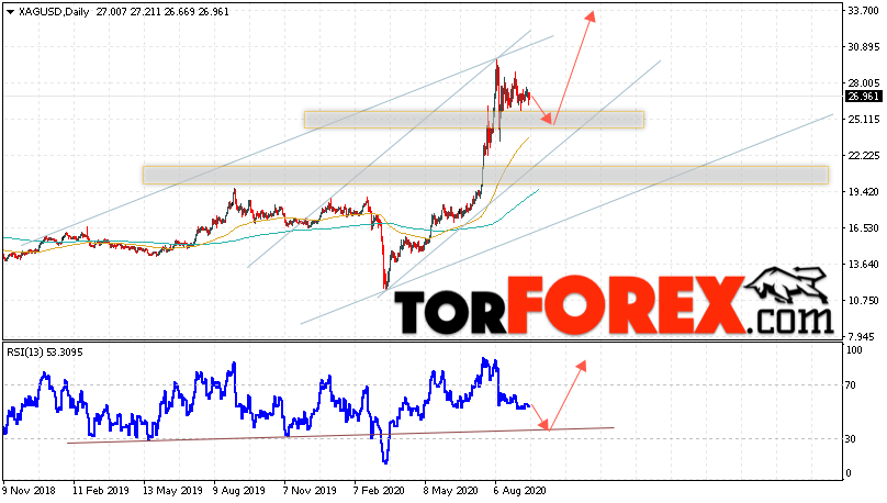 Таким образом, Прогноз цен на Серебро на неделю 21 — 25 сентября 2020 предполагает попытку теста уровня поддержки вблизи области 25.05. Затем, продолжение роста цен на Серебро с целью выше уровня 33.65. В пользу подъёма выступит тест линии тренда на индикаторе относительной силы. Отменой варианта роста XAG/USD станет падение и пробой уровня 23.25. Это укажет на продолжение снижения котировок в область ниже уровня 17.65.