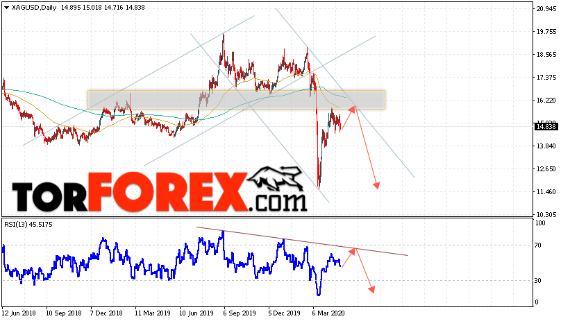 Таким образом, Прогноз цен на Серебро на неделю 4 — 8 мая 2020 предполагает попытку теста уровня сопротивления вблизи области 16.15. Затем продолжения падения цен на Серебро с целью ниже уровня 11.45. В пользу снижения выступит тест линии тренда на индикаторе относительной силы. Отменой варианта падения XAG/USD станет сильный рост и пробой уровня 17.05. Это укажет на продолжение роста котировок в область выше уровня 17.75.