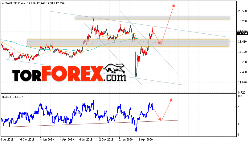 В пользу подъёма котировок и цен на Серебро на текущей торговой неделе 8 — 12 июня 2020 выступит тест линии линии тренда на индикаторе относительной силы. Вторым сигналом станет отскок от верхней границы нисходящего канала. Отменой варианта роста котировок XAG/USD выступит падение и пробой области 15.05. Это укажет на пробой области поддержки и продолжение падения цен на Серебро с целью ниже уровня 13.55. Подтверждением развития восходящей тенденции выступит пробой верхней границы нисходящего канала и закрытие выше уровня 18.35. Это укажет на ускорение подъёма цены на Серебро.