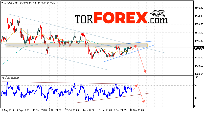 Дополнительным сигналом в пользу снижения котировок XAU/USD выступит тест нисходящей линии тренда на индикаторе относительной силы. Вторым сигналом в пользу падения цен на Золото станет отскок от верхней границы нисходящего канала. Отменой варианта снижения цен на Золото 19 декабря 2019 станет сильный рост и пробой уровня 1495. Это укажет на пробой области сопротивления и продолжение роста в область выше уровня 1535. Ожидать ускорения падения котировок XAU/USD стоит с пробоем области поддержки и закрытием под уровнем 1450, что укажет на начало отработки модели «Клин».