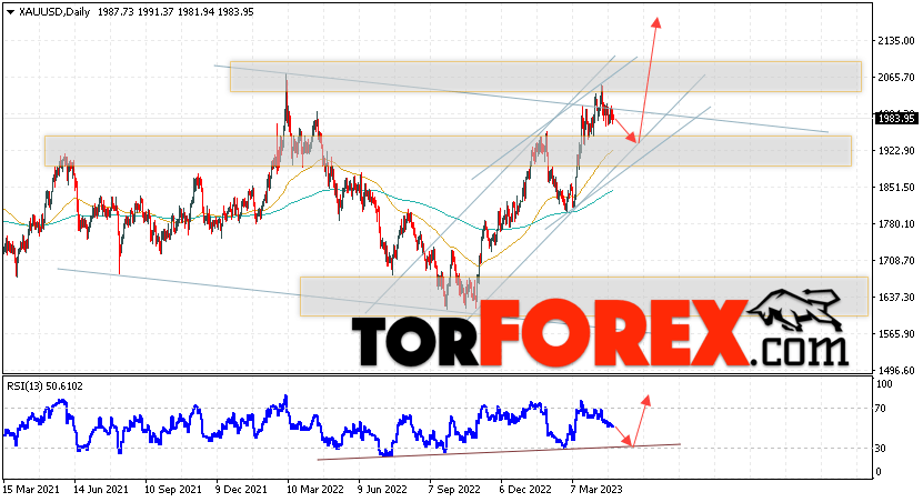 Дополнительным сигналом в пользу подъёма котировок и цен на Золото на текущей торговой неделе 1 — 5 мая 2023 выступит тест линии поддержки на индикаторе относительной силы (RSI). Вторым сигналом станет отскок от нижней границы бычьего канала. Отменой варианта роста котировок XAU/USD станет падение цены и пробой области 1875. Это укажет на пробой уровня поддержки и продолжение падения цен на Золото с целью ниже уровня 1825. Подтверждением росту стоимости актива выступит пробой области сопротивления и закрытие котировок выше уровня 2075.