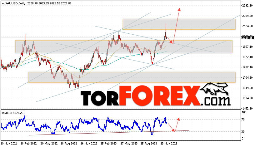 Дополнительным сигналом в пользу подъёма котировок и цен на Золото на текущей торговой неделе 11 — 15 декабря 2023 выступит отбой от линии поддержки на индикаторе относительной силы (RSI). Вторым сигналом станет отскок от верхней границы нисходящего канала. Отменой варианта роста котировок XAU/USD станет падение цены и пробой области 1895. Это укажет на пробой уровня поддержки и продолжение падения цен на Золото с целью ниже уровня 1845. Подтверждением росту стоимости актива выступит пробой области сопротивления и закрытие котировок выше уровня 2045.
