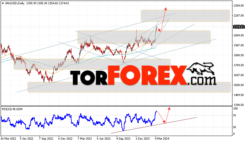 Дополнительным сигналом в пользу подъёма котировок и цен на Золото на текущей торговой неделе 11 — 15 марта 2024 выступит отбой от линии поддержки на индикаторе относительной силы (RSI). Вторым сигналом станет отскок от нижней границы бычьего канала. Отменой варианта роста котировок XAU/USD станет падение цены и пробой области 1985. Это укажет на пробой уровня поддержки и продолжение падения цен на Золото с целью ниже уровня 1915. Подтверждением росту стоимости актива выступит пробой области сопротивления и закрытие котировок выше уровня 2225, что укажет на пробой верхней границы бычьего канала, а это сигнал к росту на ширину канала.