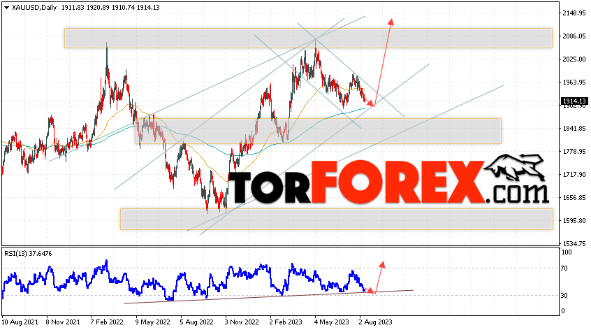 Дополнительным сигналом в пользу подъёма котировок и цен на Золото на текущей торговой неделе 14 — 18 августа 2023 выступит отбой от линии поддержки на индикаторе относительной силы (RSI). Вторым сигналом станет отскок от нижней границы бычьего канала. Отменой варианта роста котировок XAU/USD станет падение цены и пробой области 1845. Это укажет на пробой уровня поддержки и продолжение падения цен на Золото с целью ниже уровня 1775. Подтверждением росту стоимости актива выступит пробой области сопротивления и закрытие котировок выше уровня 1975, что укажет на пробой верхней границы нисходящего канала коррекции.