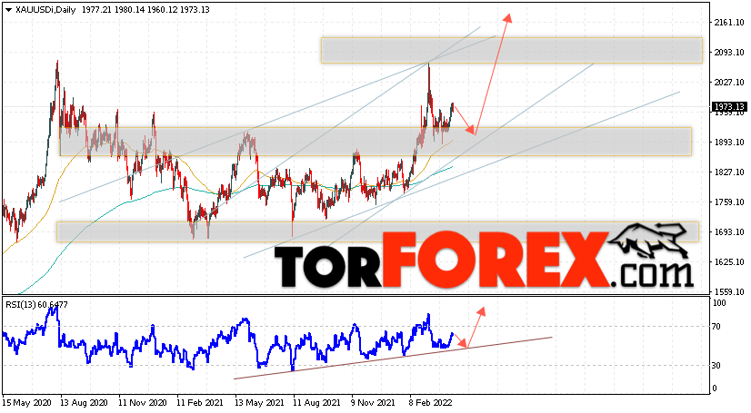 Дополнительным сигналом в пользу подъёма котировок и цен на Золото на текущей торговой неделе 18 — 22 апреля 2022 выступит тест линии тренда на индикаторе относительной силы (RSI). Вторым сигналом станет отскок от нижней границы бычьего канала. Отменой варианта роста котировок XAU/USD выступит падение и пробой области 1835. Это укажет на пробой уровня поддержки и продолжение падения цен на Золото с целью ниже уровня 1765. Подтверждением роста стоимости актива выступит пробой области сопротивления и закрытие котировок выше уровня 2025.