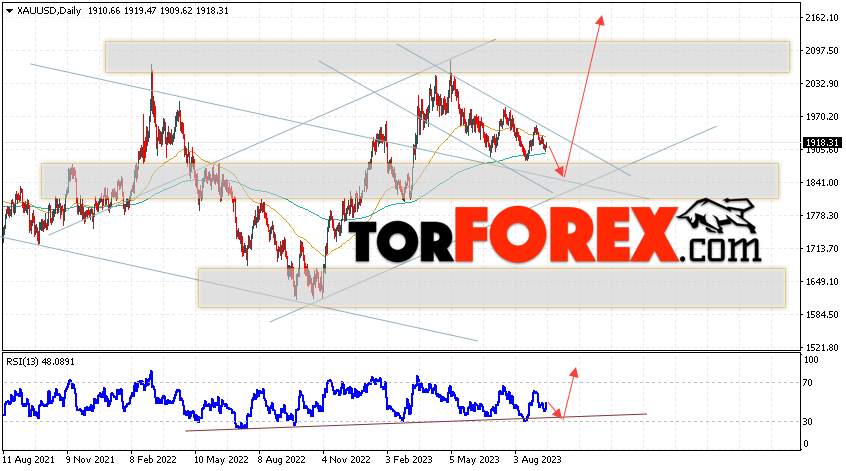 Таким образом, Прогноз цены Золота на 18 — 22 сентября 2023 предполагает попытку развития снижения и теста уровня поддержки вблизи области 1865. Затем, продолжение роста цен на Золото с целью выше уровня 2165. В пользу подъёма котировок выступит тест линии тренда на индикаторе относительной силы. Отменой варианта роста Золота станет падение и пробой уровня 1835. Это укажет на продолжение снижения котировок в область ниже уровня 1785.