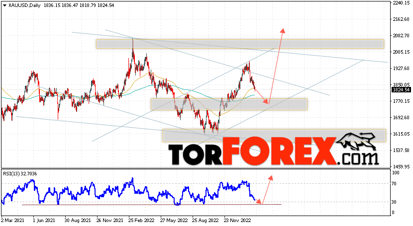 Дополнительным сигналом в пользу подъёма котировок и цен на Золото на текущей торговой неделе 20 — 24 февраля 2023 выступит тест линии поддержки на индикаторе относительной силы (RSI). Вторым сигналом станет отскок от нижней границы бычьего канала. Отменой варианта роста котировок XAU/USD станет падение цены и пробой области 1675. Это укажет на пробой уровня поддержки и продолжение падения цен на Золото с целью ниже уровня 1605. Подтверждением росту стоимости актива выступит пробой области сопротивления и закрытие котировок выше уровня 1925, что укажет на пробой верхней границы нисходящего канала.