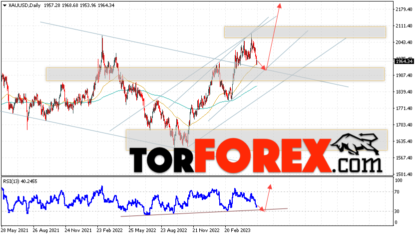 Дополнительным сигналом в пользу подъёма котировок и цен на Золото на текущей торговой неделе 22 — 26 мая 2023 выступает формирование разворотной модели «Голова и плечи» на индикаторе относительной силы (RSI). Вторым сигналом станет отскок от нижней границы бычьего канала. Отменой варианта роста котировок XAU/USD станет падение цены и пробой области 1890. Это укажет на пробой уровня поддержки и продолжение падения цен на Золото с целью ниже уровня 1835. Подтверждением росту стоимости актива выступит пробой области сопротивления и закрытие котировок выше уровня 2105.