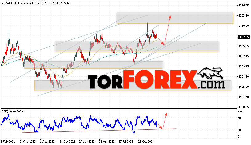 Дополнительным сигналом в пользу подъёма котировок и цен на Золото на текущей торговой неделе 22 — 26 января 2024 выступит отбой от линии поддержки на индикаторе относительной силы (RSI). Вторым сигналом станет отскок от верхней границы нисходящего канала. Отменой варианта роста котировок XAU/USD станет падение цены и пробой области 1915. Это укажет на пробой уровня поддержки и продолжение падения цен на Золото с целью ниже уровня 1855. Подтверждением росту стоимости актива выступит пробой области сопротивления и закрытие котировок выше уровня 2125.