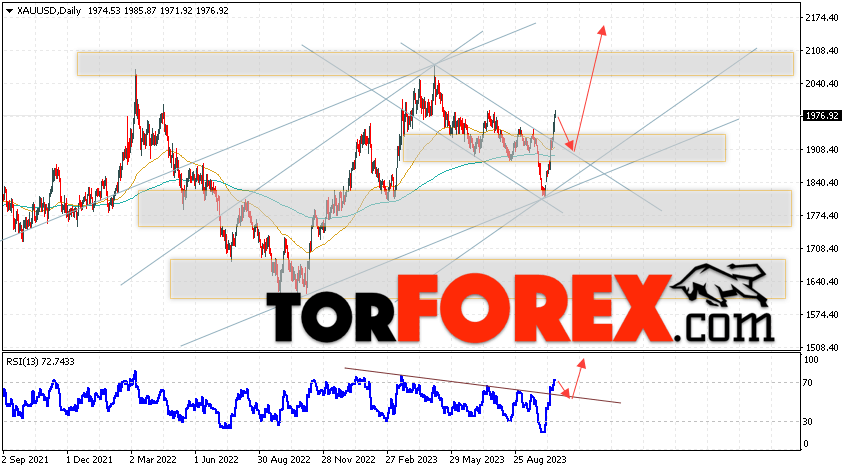 Дополнительным сигналом в пользу подъёма котировок и цен на Золото на текущей торговой неделе 23 — 27 октября 2023 выступит отбой от линии поддержки на индикаторе относительной силы (RSI). Вторым сигналом станет отскок от верхней границы медвежьего канала. Отменой варианта роста котировок XAU/USD станет падение цены и пробой области 1825. Это укажет на пробой уровня поддержки и продолжение падения цен на Золото с целью ниже уровня 1765. Подтверждением росту стоимости актива выступит пробой области сопротивления и закрытие котировок выше уровня 1995.