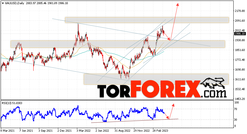 Дополнительным сигналом в пользу подъёма котировок и цен на Золото на текущей торговой неделе 24 — 28 апреля 2023 выступит тест линии поддержки на индикаторе относительной силы (RSI). Вторым сигналом станет отскок от нижней границы бычьего канала. Отменой варианта роста котировок XAU/USD станет падение цены и пробой области 1875. Это укажет на пробой уровня поддержки и продолжение падения цен на Золото с целью ниже уровня 1815. Подтверждением росту стоимости актива выступит пробой области сопротивления и закрытие котировок выше уровня 2105.
