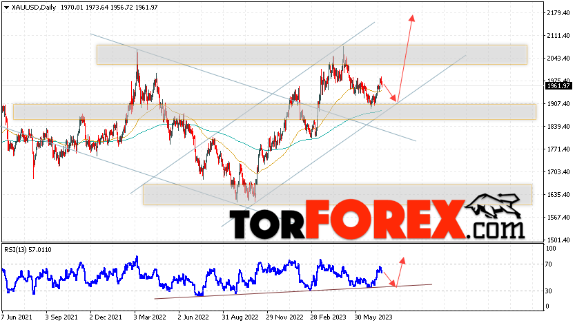 Таким образом, Прогноз цены Золота на 24 — 28 июля 2023 предполагает попытку развития снижения и теста уровня поддержки вблизи области 1910. Затем, продолжение роста цен на Золото с целью выше уровня 2180. В пользу подъёма котировок выступит тест линии тренда на индикаторе относительной силы. Отменой варианта роста Золота станет падение и пробой уровня 1835. Это укажет на продолжение снижения котировок в область ниже уровня 1775.