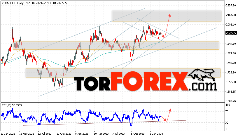 Дополнительным сигналом в пользу подъёма котировок и цен на Золото на текущей торговой неделе 26 февраля — 1 марта 2024 выступит отбой от линии поддержки на индикаторе относительной силы (RSI). Вторым сигналом станет отскок от нижней границы бычьего канала. Отменой варианта роста котировок XAU/USD станет падение цены и пробой области 1935. Это укажет на пробой уровня поддержки и продолжение падения цен на Золото с целью ниже уровня 1865. Подтверждением росту стоимости актива выступит пробой области сопротивления и закрытие котировок выше уровня 2045, что укажет на пробой верхней границы нисходящего канала коррекции.