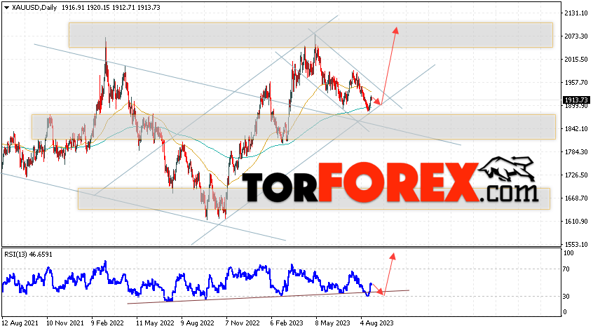 Дополнительным сигналом в пользу подъёма котировок и цен на Золото на текущей торговой неделе 28 августа — 1 сентября 2023 выступит отбой от линии поддержки на индикаторе относительной силы (RSI). Вторым сигналом станет отскок от нижней границы бычьего канала. Отменой варианта роста котировок XAU/USD станет падение цены и пробой области 1835. Это укажет на пробой уровня поддержки и продолжение падения цен на Золото с целью ниже уровня 1765. Подтверждением росту стоимости актива выступит пробой области сопротивления и закрытие котировок выше уровня 1965, что укажет на пробой верхней границы нисходящего канала коррекции.