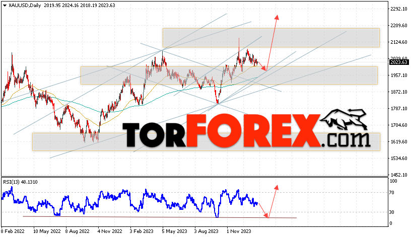 Дополнительным сигналом в пользу подъёма котировок и цен на Золото на текущей торговой неделе 29 января — 2 февраля 2024 выступит отбой от линии поддержки на индикаторе относительной силы (RSI). Вторым сигналом станет отскок от верхней границы нисходящего канала. Отменой варианта роста котировок XAU/USD станет падение цены и пробой области 1925. Это укажет на пробой уровня поддержки и продолжение падения цен на Золото с целью ниже уровня 1865. Подтверждением росту стоимости актива выступит пробой области сопротивления и закрытие котировок выше уровня 2055.