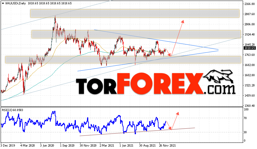 Дополнительным сигналом в пользу подъёма котировок и цен на Золото на текущей торговой неделе 3 — 7 января 2022 выступит тест линии тренда на индикаторе относительной силы. Вторым сигналом станет отскок от нижней границы модели ”Треугольник”. Отменой варианта роста котировок XAU/USD выступит падение и пробой области 1685. Это укажет на пробой уровня поддержки и продолжение падения цен на Золото с целью ниже уровня 1625. Подтверждением роста стоимости актива выступит пробой области сопротивления и закрытие котировок выше уровня 1925, что укажет на пробой верхней границы модели ”Треугольник” и начало отработки этого паттерна.