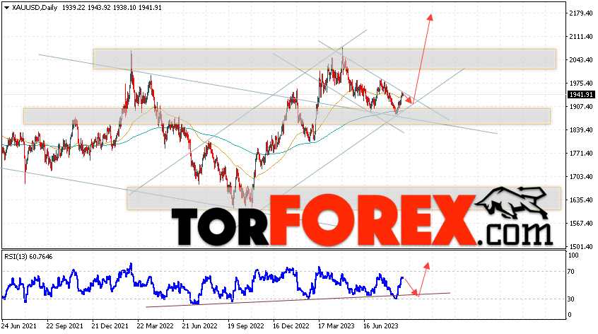 Дополнительным сигналом в пользу подъёма котировок и цен на Золото на текущей торговой неделе 4 — 8 сентября 2023 выступит отбой от линии поддержки на индикаторе относительной силы (RSI). Вторым сигналом станет отскок от нижней границы бычьего канала. Отменой варианта роста котировок XAU/USD станет падение цены и пробой области 1835. Это укажет на пробой уровня поддержки и продолжение падения цен на Золото с целью ниже уровня 1765. Подтверждением росту стоимости актива выступит пробой области сопротивления и закрытие котировок выше уровня 1965, что укажет на пробой верхней границы нисходящего канала коррекции.
