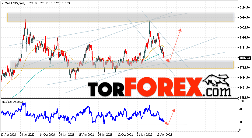 Дополнительным сигналом в пользу подъёма котировок и цен на Золото на текущей торговой неделе 16 — 20 мая 2022 выступит тест линии тренда на индикаторе относительной силы (RSI). Вторым сигналом станет отскок от нижней границы бычьего канала. Отменой варианта роста котировок XAU/USD выступит падение и пробой области 1765. Это укажет на пробой уровня поддержки и продолжение падения цен на Золото с целью ниже уровня 1705. Подтверждением роста стоимости актива выступит пробой области сопротивления и закрытие котировок выше уровня 1915, что укажет на пробой верхней границы нисходящего канала.