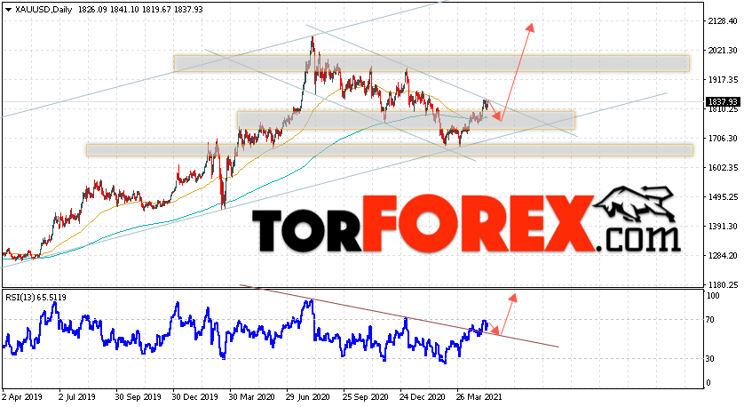 Дополнительным сигналом в пользу подъёма котировок и цен на Золото на текущей торговой неделе 17 — 21 мая 2021 выступит тест линии тренда на индикаторе относительной силы. Вторым сигналом станет пробой верхней границы медвежьего канала. Отменой варианта роста котировок XAU/USD выступит падение и пробой области 1595. Это укажет на пробой уровня поддержки и продолжение падения цен на Золото с целью ниже уровня 1525. Подтверждением роста стоимости актива выступит пробой области сопротивления и закрытие котировок выше уровня 1865, что укажет на пробой верхней границы нисходящего канала, что также укажет на завершение нисходящей коррекции.