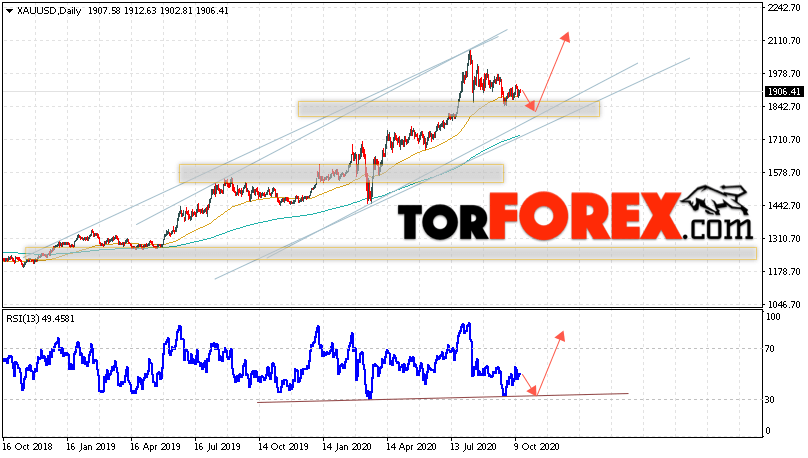 Дополнительным сигналом в пользу подъёма котировок и цен на Золото на текущей торговой неделе 19 — 23 октября 2020 выступит тест восходящей линии тренда на индикаторе относительной силы. Вторым сигналом станет отскок от нижней границы восходящего канала. Отменой варианта роста котировок XAU/USD выступит падение и пробой области 1705. Это укажет на пробой уровня поддержки и продолжение падения цен на Золото с целью ниже уровня 1655. Подтверждением роста стоимости актива выступит пробой области сопротивления и закрытие котировок выше уровня 1985, что укажет на пробой верхней границы нисходящего канала.