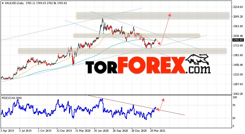 Таким образом, Прогноз цены Золота на неделю 26 — 30 апреля 2021 предполагает попытку теста уровня поддержки вблизи области 1715. Затем, продолжение роста цен на Золото с целью выше уровня 2095. В пользу подъёма котировок выступит тест линии тренда на индикаторе относительной силы. Отменой варианта роста Золота станет падение и пробой уровня 1585. Это укажет на продолжение снижения котировок в область ниже уровня 1455.