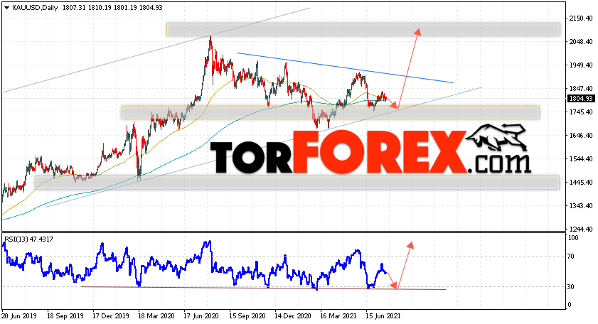 Дополнительным сигналом в пользу подъёма котировок и цен на Золото на текущей торговой неделе 26 июля — 1 августа 2021 выступит тест линии тренда на индикаторе относительной силы. Вторым сигналом станет отскок от нижней границы бычьего канала. Отменой варианта роста котировок XAU/USD выступит падение и пробой области 1655. Это укажет на пробой уровня поддержки и продолжение падения цен на Золото с целью ниже уровня 1545. Подтверждением роста стоимости актива выступит пробой области сопротивления и закрытие котировок выше уровня 1965, что укажет на завершение формирования разворотной модели ”Голова и плечи”.