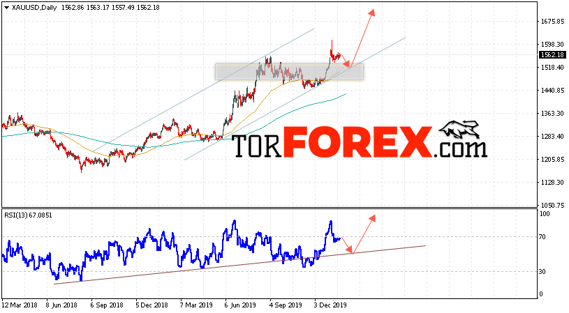 Дополнительным сигналом в пользу роста котировок и цен на Золото на текущей торговой неделе 27 — 31 января 2020 выступит тест восходящей линии тренда на индикаторе относительной силы. Вторым сигналом станет отскок от нижней границы восходящего канала. Отменой варианта роста котировок XAU/USD выступит падение и пробой области 1450. Это укажет на пробой уровня поддержки и продолжение падения цен на Золото с целью ниже уровня 1395. Подтверждением роста стоимости актива выступит пробой области сопротивления и закрытие котировок выше уровня 1625.