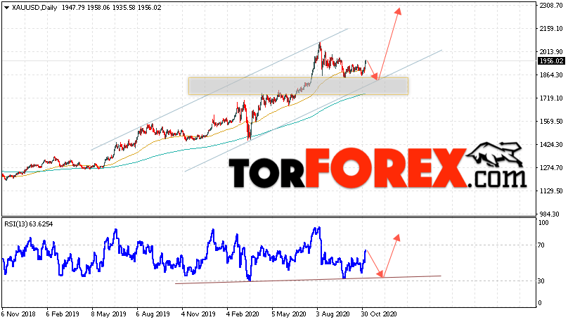 Дополнительным сигналом в пользу подъёма котировок и цен на Золото на текущей торговой неделе 9 — 13 ноября 2020 выступит тест восходящей линии тренда на индикаторе относительной силы. Вторым сигналом станет отскок от нижней границы восходящего канала. Отменой варианта роста котировок XAU/USD выступит падение и пробой области 1725. Это укажет на пробой уровня поддержки и продолжение падения цен на Золото с целью ниже уровня 1645. Подтверждением роста стоимости актива выступит пробой области сопротивления и закрытие котировок выше уровня 2025.