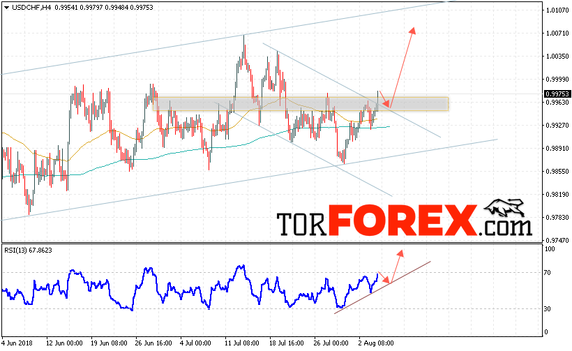 Таким образом, USD/CHF прогноз Доллар Франк на 7 августа 2018 предполагает попытку теста области поддержки вблизи уровня 0.9955 и продолжение роста пары USD/CHF с целью выше уровня 1.0070, дополнительным сигналом в пользу роста пары Доллар Франк выступит тест линии тренда на индикаторе относительной силы, отменой варианта подъёма станет снижение и пробой области 0.9870, что укажет на пробой нижней границы восходящего канала и продолжение падения пары.