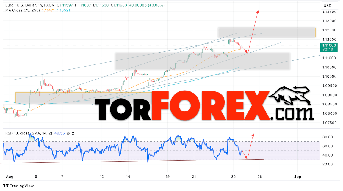 Валютная пара Евро Доллар продолжает движение в рамках развития коррекции и бычьего канала. Скользящие средние указывают на наличие краткосрочной восходящей тенденции по паре EUR/USD. В момент подготовки прогноза цены пробили область между сигнальными вверх, что указывает на давление со стороны покупателей европейской валюты и потенциальное продолжение роста котировок доллара США с текущих уровней. В рамках Форекс прогноза на 27 августа 2024 стоит ожидать попытку развития падения цены и тест уровня поддержки, который располагается на паре EUR/USD вблизи отметки 1.1115. Далее, отскок цен вверх и продолжение роста валютной пары Евро Доллар. Потенциальной целью такого движения на FOREX выступает область выше отметки 1.1355.